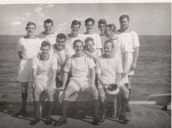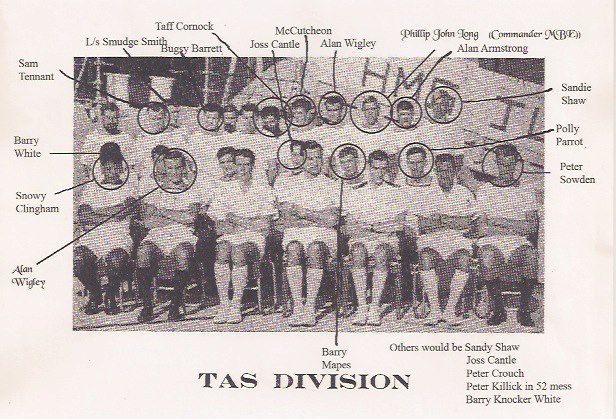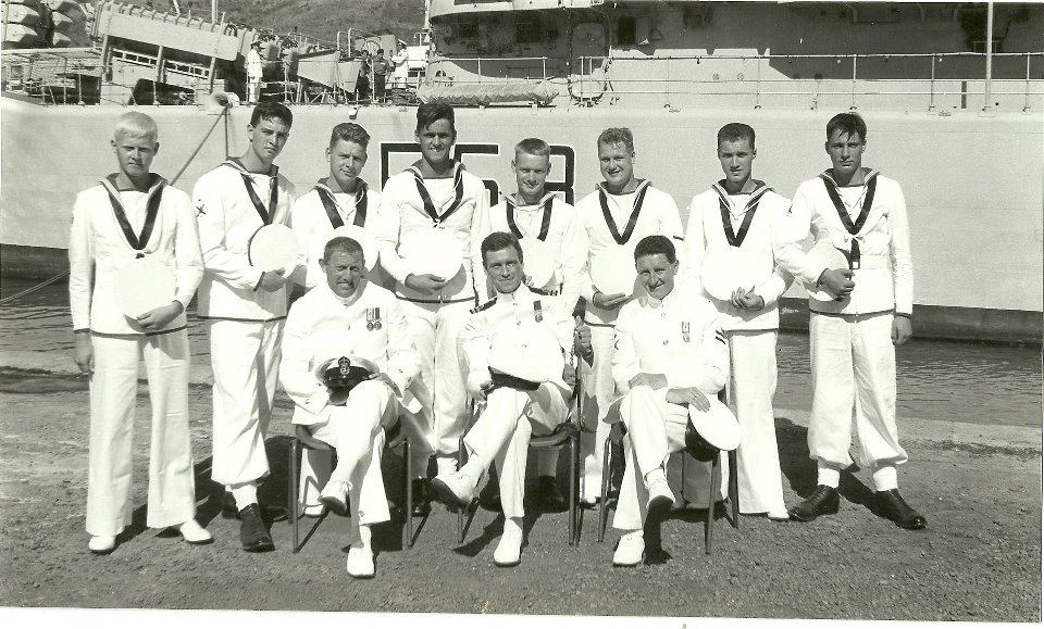 Others in this photo - third row - L- R, Pony Moore, with Tony Godwin peeking over his shoulder) don't know, don't know, Trev English, don't know, don't know, Nobby Hall - Ken Batson is the US Chief on the right with Lt Cdr Pete Crews in the centre - Jan Pearce front row left. back row includes - Deaks Deakin, Scouse Lendon, Bob Riches; Sugar Plumb is in the centre of the pic. Kerry Packer, Sandy Sanders and Joe Jordan are three submariners |